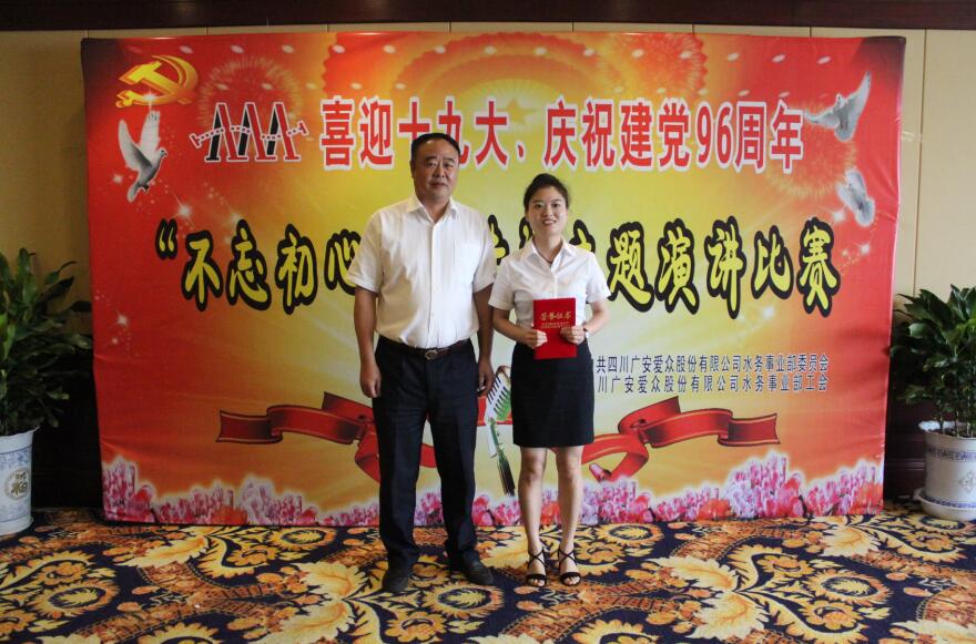 经过激烈角逐,评委们从演讲材料、语言表达、形体语言、主体形象多方面综合考量,采取现场打分的方式,评出了一等奖、二等奖、三等奖和优秀奖。来自广安花园制水有限公司的选手陈肖依,凭借充分的准备和完美的舞台表现,以一篇《不忘初心跟党走-为人民服务》摘得桂冠,成为比赛的冠军。